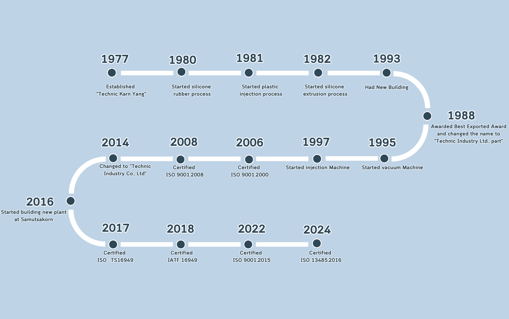 Technic Industry Company Limited was established in year 1977 by Mr. Arunchai Wisetwongsahakit which is currently the Chairman of the Board of Directors. With the chairman's intention who committed to the honesty towards our customer as well as the policy (Customer Policy) of following Customer's Satisfaction through the past 45 years, Technic Industry Co., Ltd. have upgrading our production standards and developing our management systems in order to meet customer requirement. Our production process have starting from Rubber Molding Part, which is one of a component in thermos and then the plastic injection production process in order to gives customers more convenience. Later then, we have added extrusion process for serving materials such as silicone rubber and plastic. Currently, Technic Industry Company Limited have 4 main production processes which are Rubber Molding Line, Injection Plastic Line, Plastic Extrusion, Silicone Extrusion